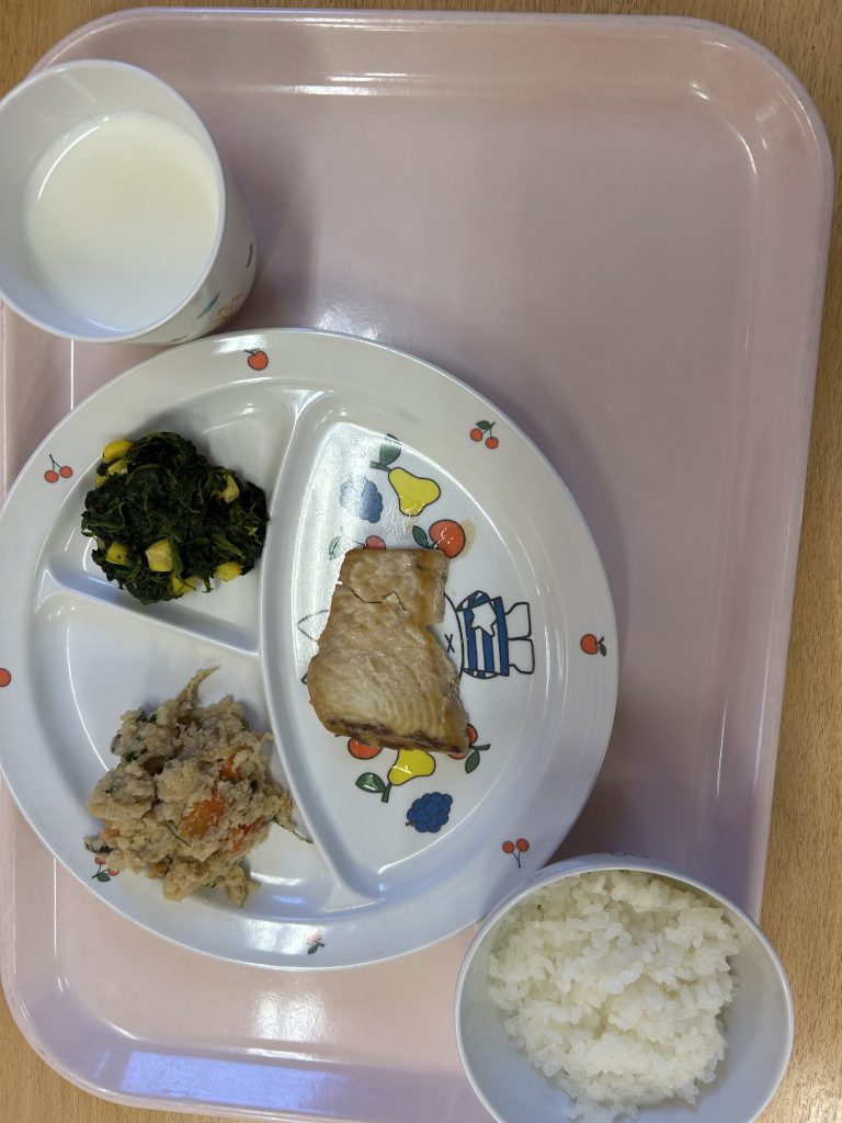 カジキの照り焼き ほうれん草としめじのソテー うの花炒り煮 ご飯 牛乳