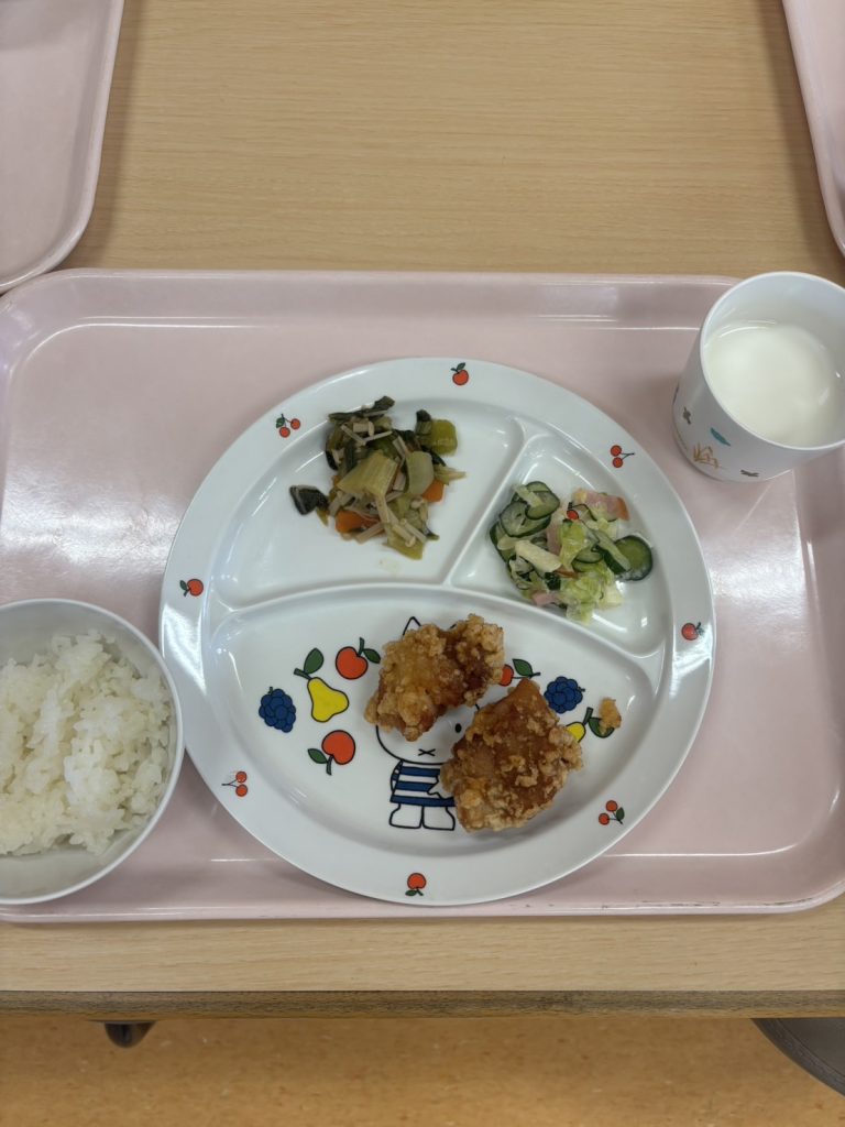 鶏の唐揚げ 青梗菜の土佐煮 フレンチサラダ ご飯 牛乳