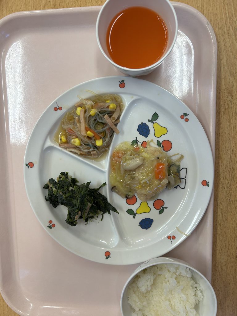 鶏肉の野菜あんかけ ポパイソテー 春雨サラダ ご飯 野菜ジュース