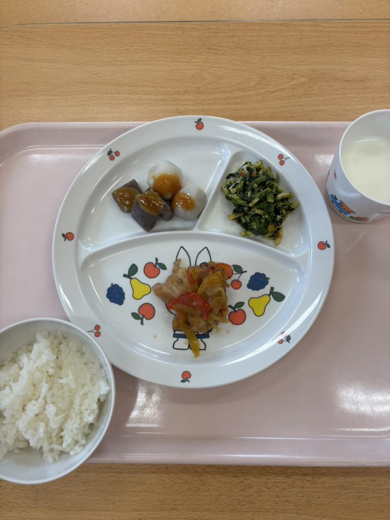 ご飯 鶏肉のBBQ焼き 里芋と蒟蒻の味噌田楽 ほうれん草と卵の三色和え 牛乳