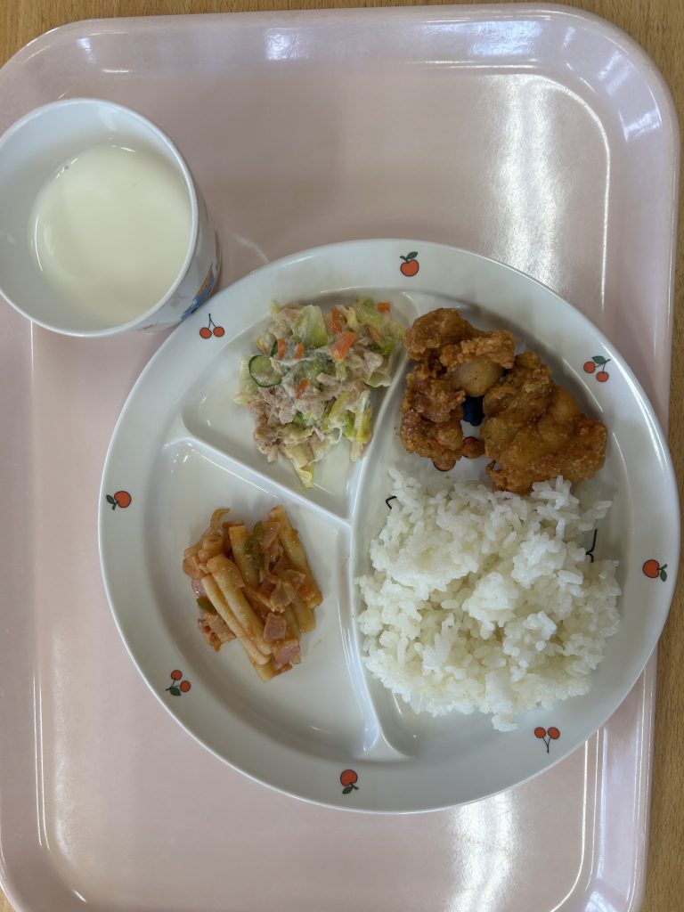 鶏の塩唐揚げ ツナサラダ マカロニソテー ご飯 牛乳