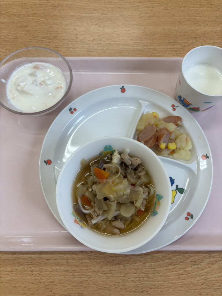 けんちんうどん ウインナーとポテトのソテー フルーツヨーグルト 牛乳