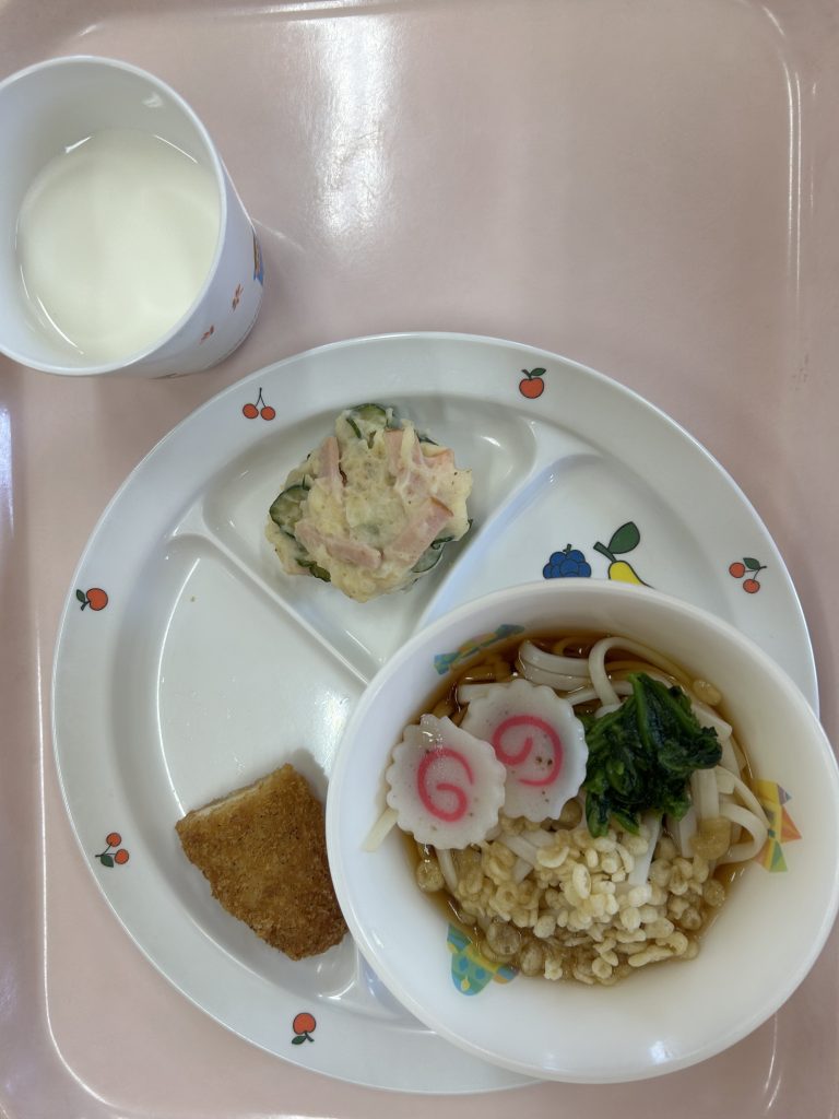たぬきうどん ポテトのごま風味サラダ ささみのチーズかつ 牛乳