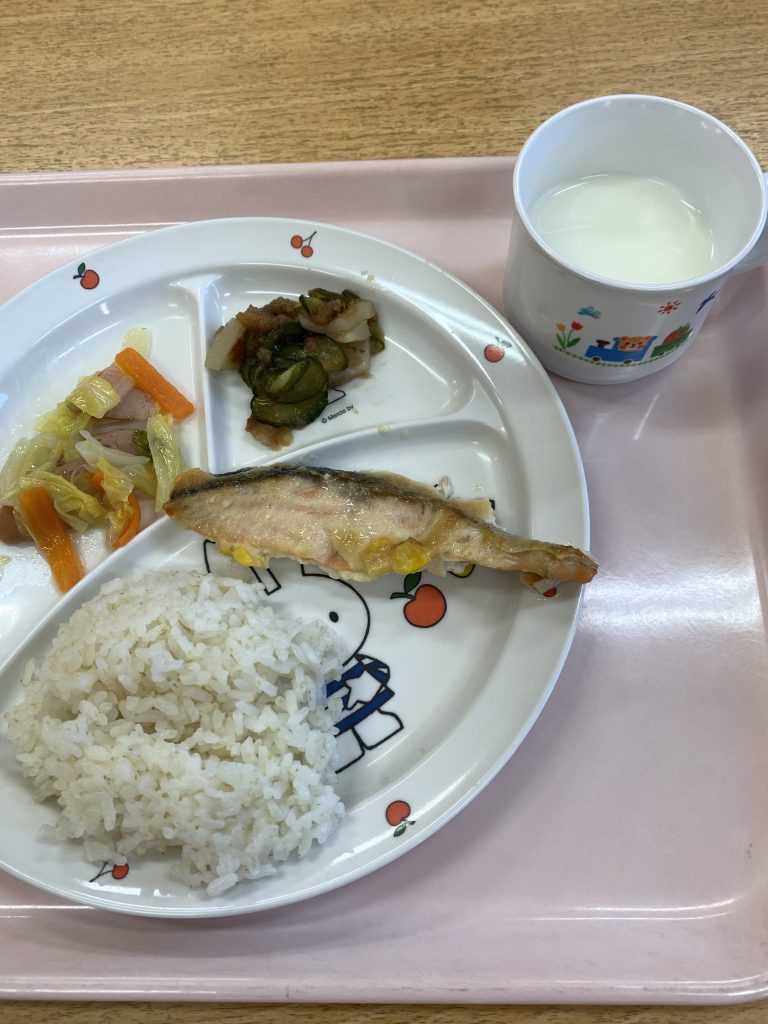 11/16の給食 鮭のコーンマヨネーズ焼き ウインナーと野菜のソテー 胡瓜とカブの梅たたき ご飯 牛乳