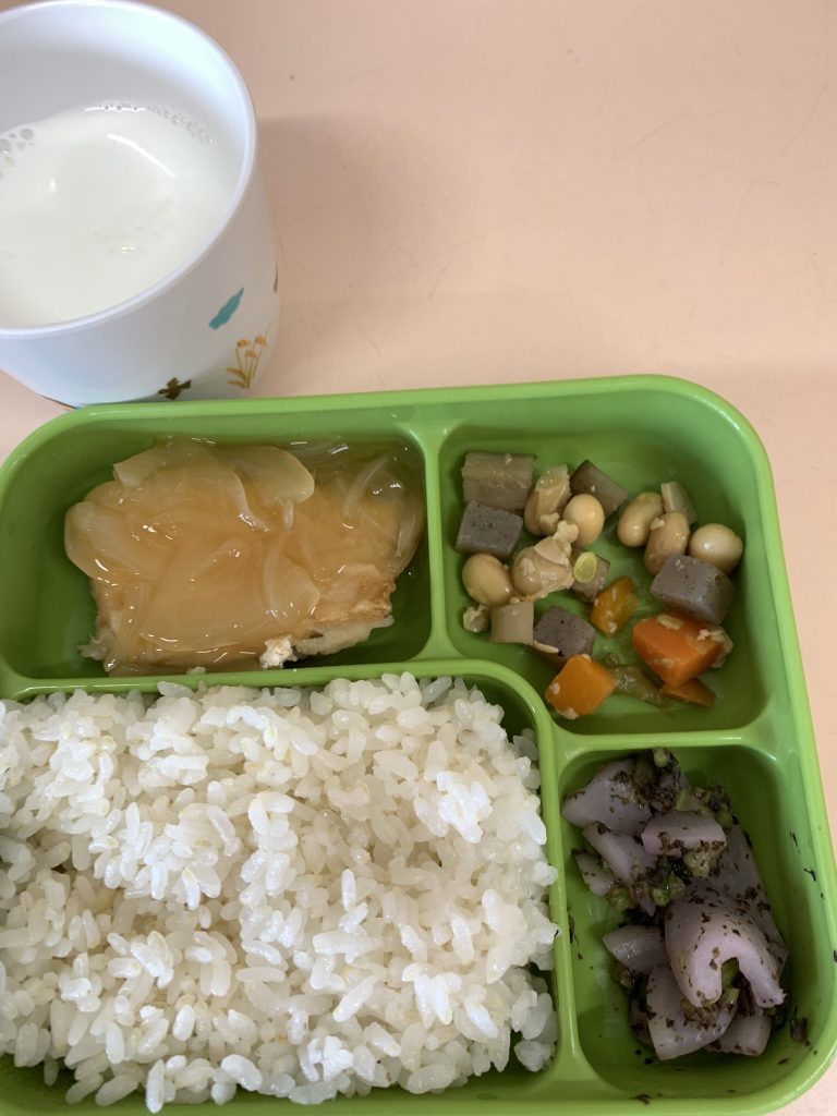 4/12の給食 かじきのさっぱり甘酢ソース 五目煮豆 カブのゆかり和え ご飯 牛乳