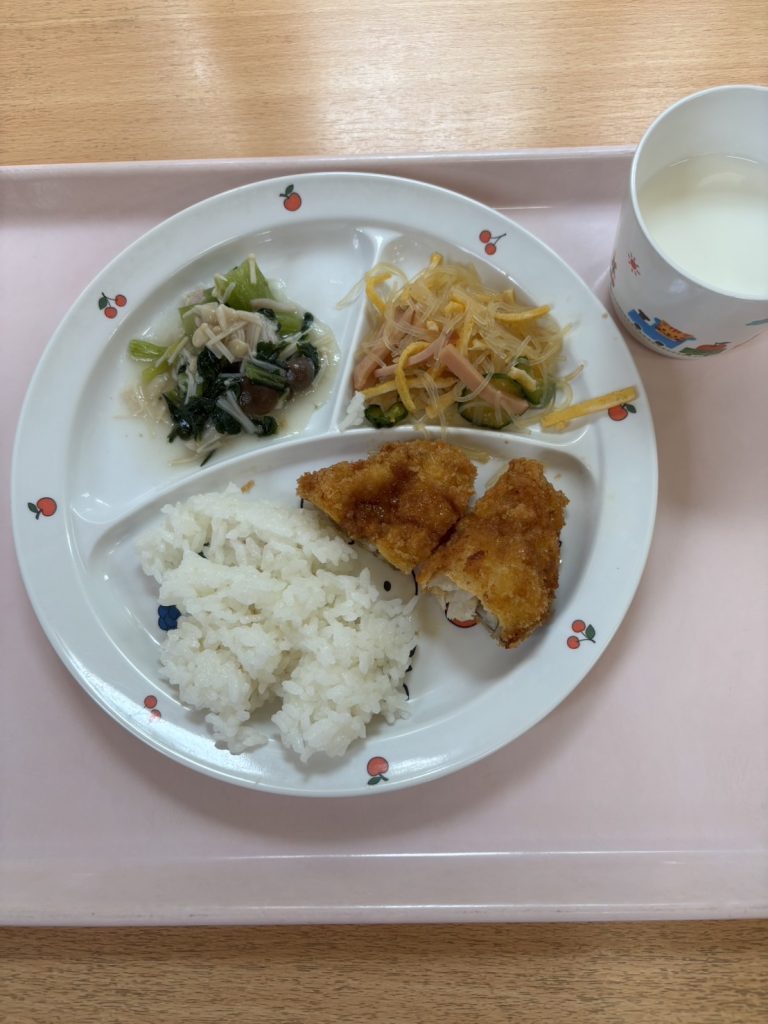 白身魚のフライ 小松菜とキノコのソテー バンサンスー ご飯 牛乳