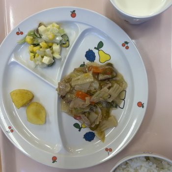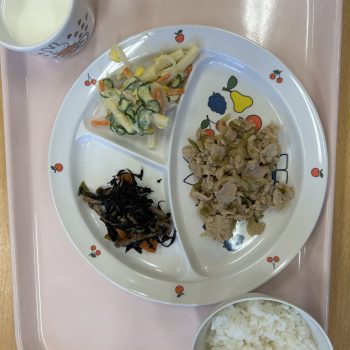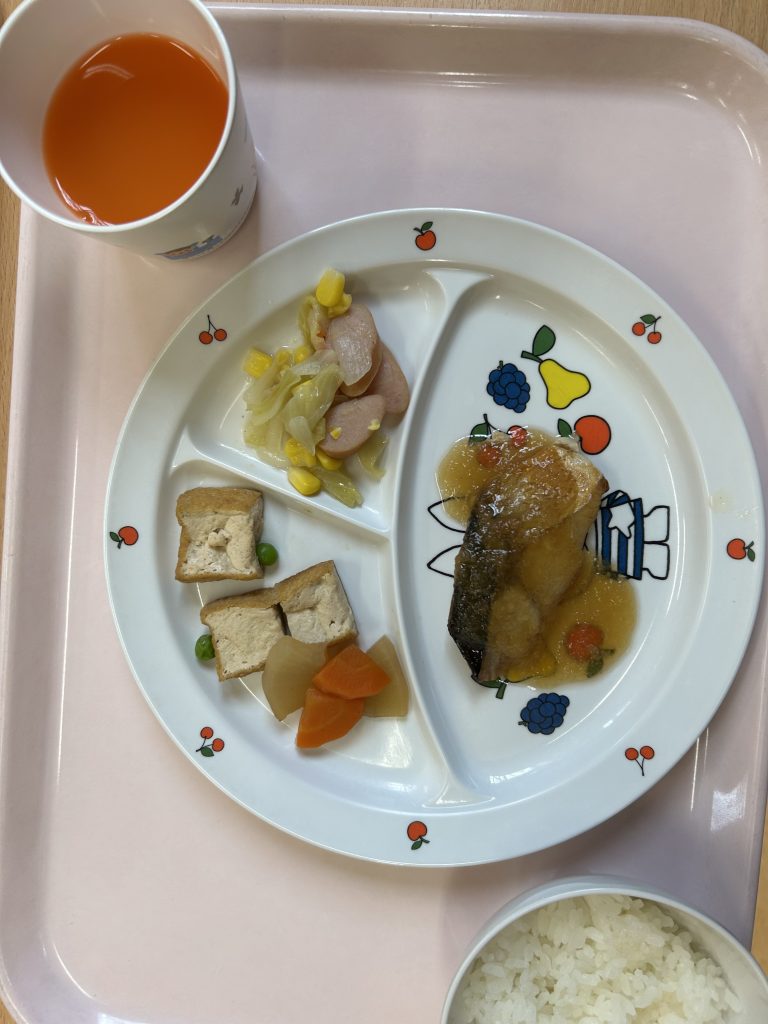 鯖のおろし煮 ウインナーと野菜のソテー 生揚げの煮物 ご飯 野菜ジュース