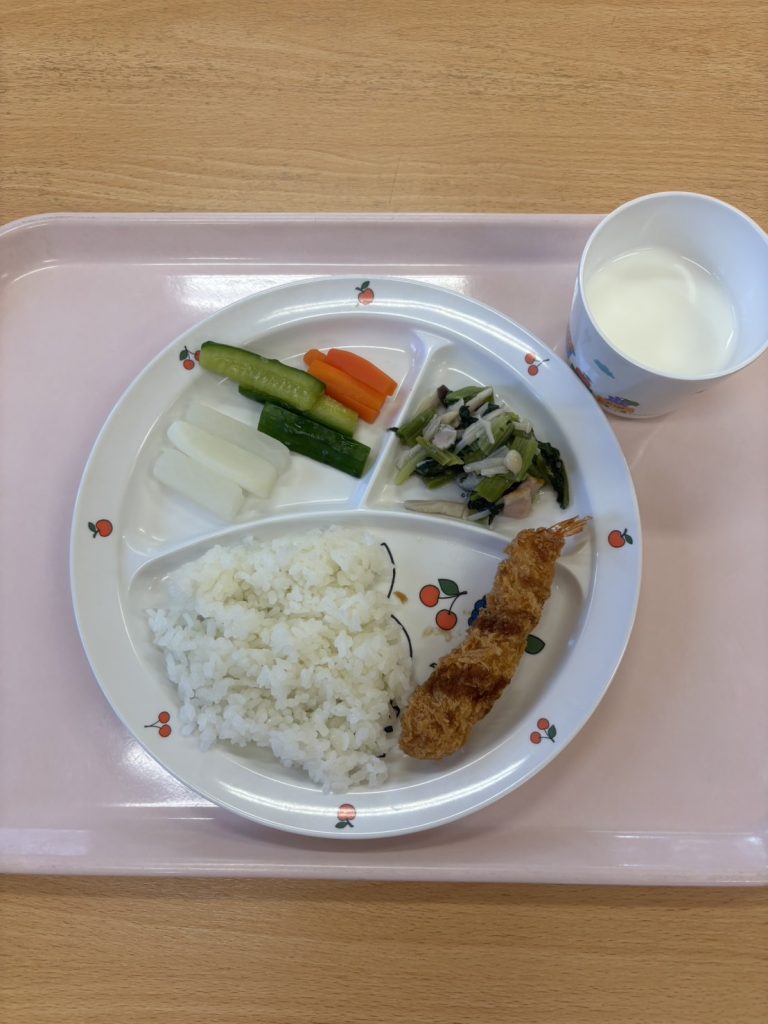 エビフライ きのこのソテー 塩野菜スティック ご飯 牛乳