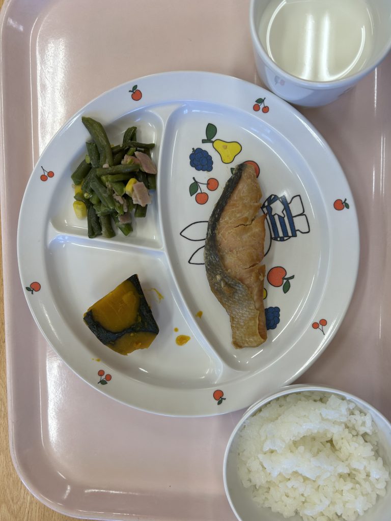 鮭の西京焼き いんげんとベーコンのソテー かぼちゃの蜂蜜煮 ご飯 牛乳