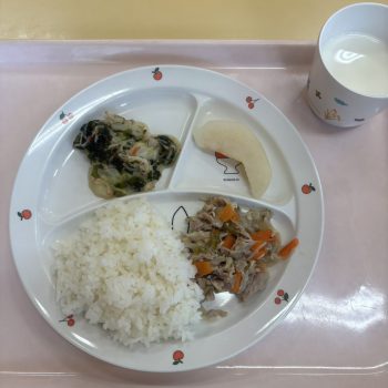 豚肉と野菜の塩ダレ炒め カニ風味あえ 梨 ご飯 牛乳