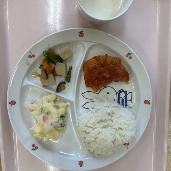鶏肉のトマト煮 チーズ入りポテトサラダ 高野豆腐の煮物 ご飯 牛乳