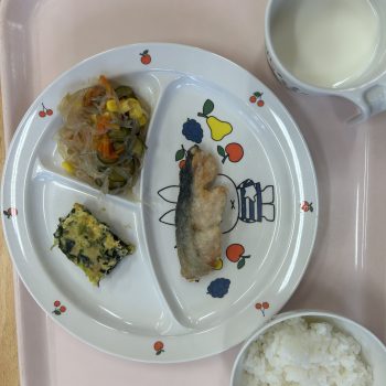 鮭のムニエル ほうれん草とベーコンのキッシュ はるさめサラダ ご飯 牛乳