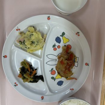 鶏肉と野菜の焼き肉風 サツマイモサラダ 小松菜の土佐煮 ご飯 牛乳