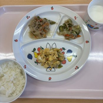 鶏の親子煮 春雨炒め キャベツとしらすのサラダ ご飯 牛乳