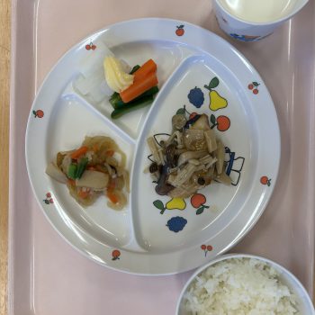 鰤のステーキきのこソース 切り干し大根の煮物 野菜スティック ご飯 牛乳