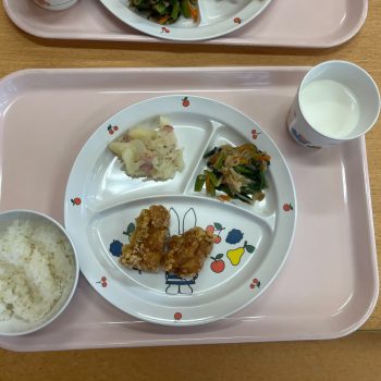鶏の唐揚げ ジャーマンポテト 小松菜のさっぱり和え ご飯 牛乳
